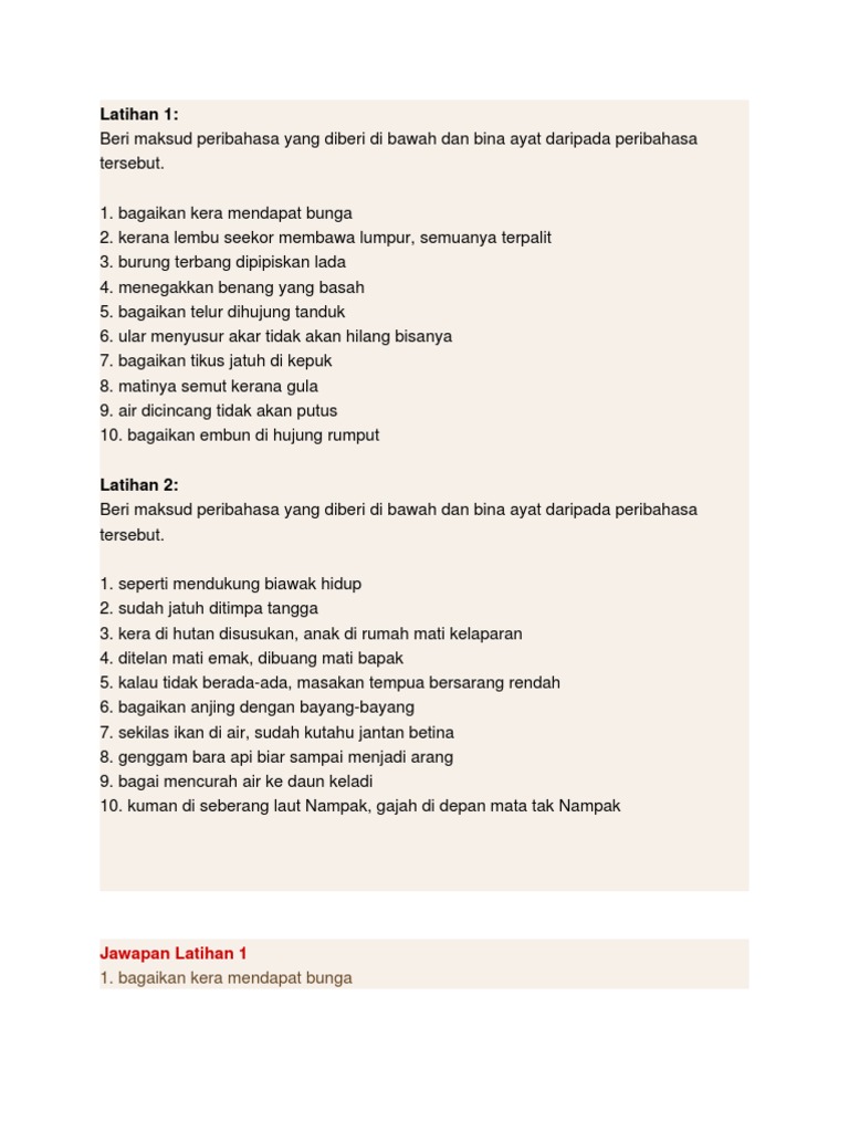 Kerana lembu seekor membawa lumpur semuanya terpalit 3. Seperti Kera Mendapat Bunga Seperti Kera Diberi Kaca. Latihan 1 Bagaikan Kera Mendapat Bunga -Orang Yang Tidak Tahu Menghargai Pemberian Orang Lain.