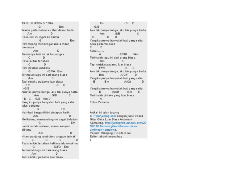 Nov 08 2018 Aku tak punya bunga D C G Aku tak punya harta C G Yang ku punya hanyalah D Hati yang setia G C G D Tulus padamu musik D G Em D chorus D G D G Terimalah lagu ini dari orang biasa E A E A Terimalah lagu ini dari orang biasa G D A E Tapi cintaku padamu luar biasa E A Aku tak punya bunga E D A Aku tak punya harta.